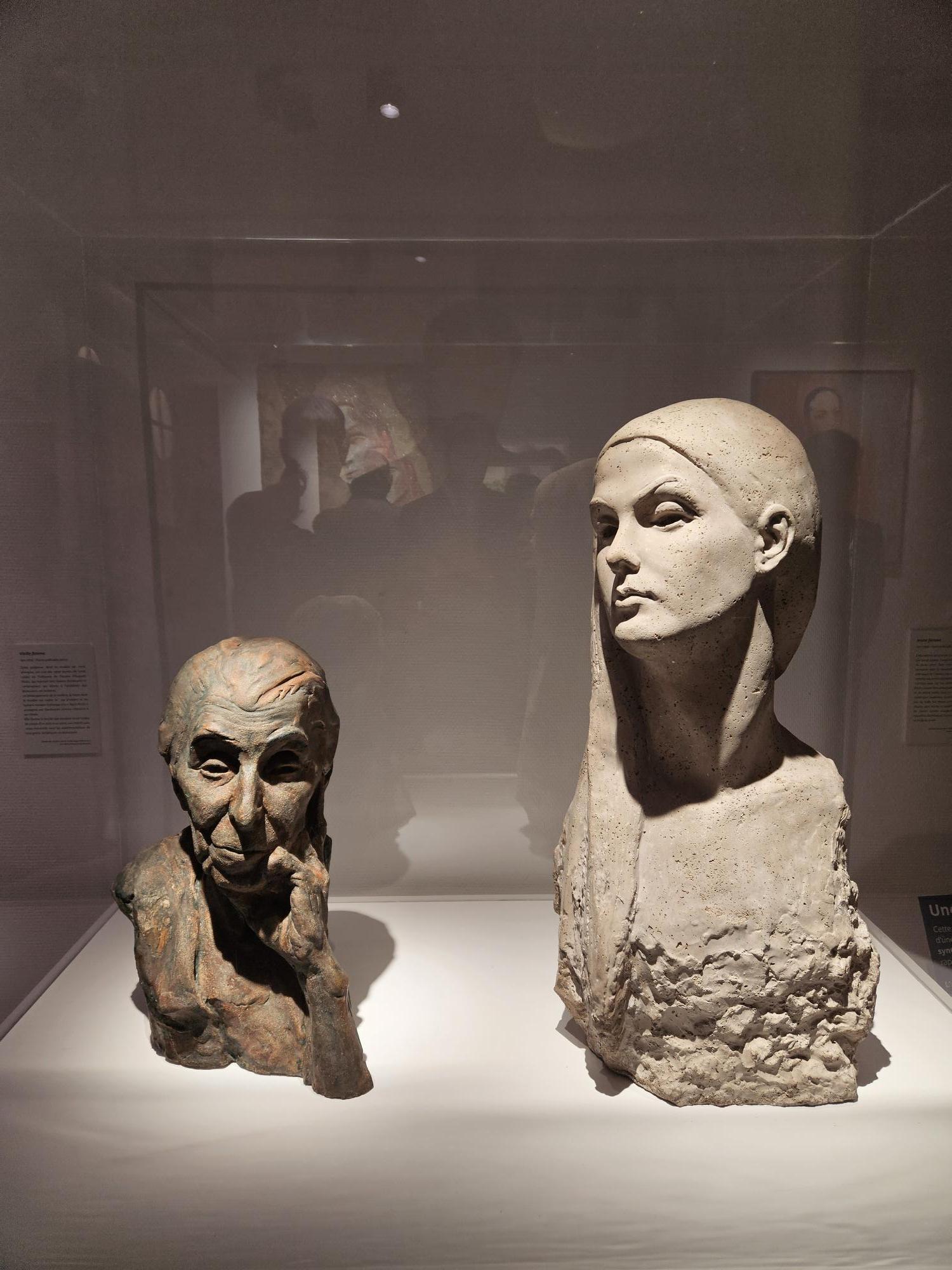 À gauche : Sarah Lipska, Vieille femme et Jeune femme au Musée d'art et d'histoire de Meudon / à droite : Sarah Lipska, Vieille femme, © Sarah Lipska. Musées de la ville de Boulogne-Billancourt - Photo Henri Delage